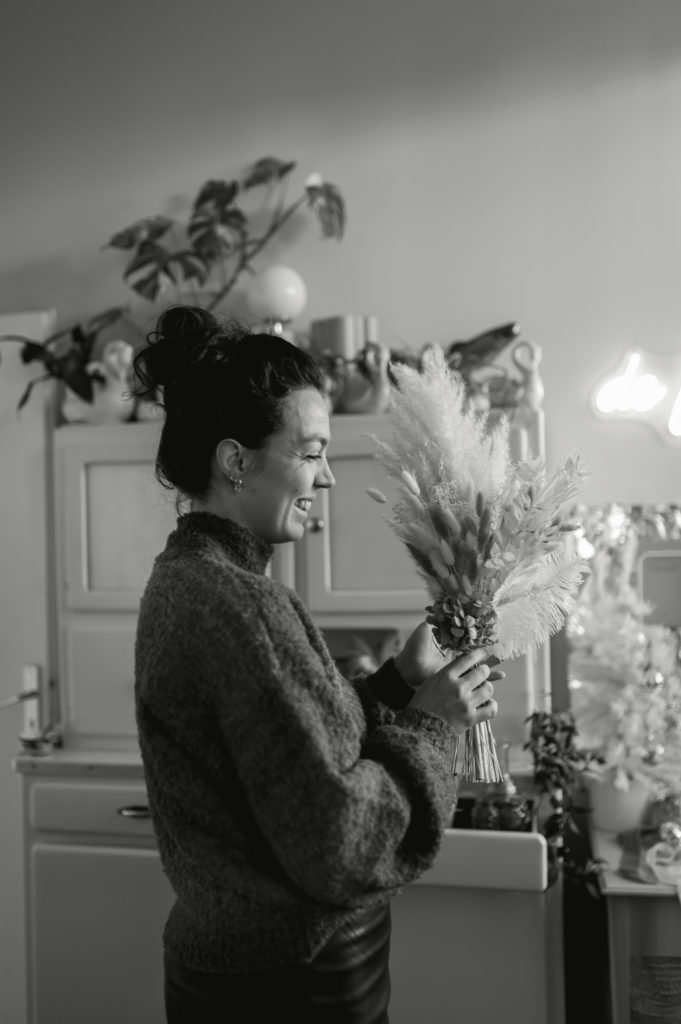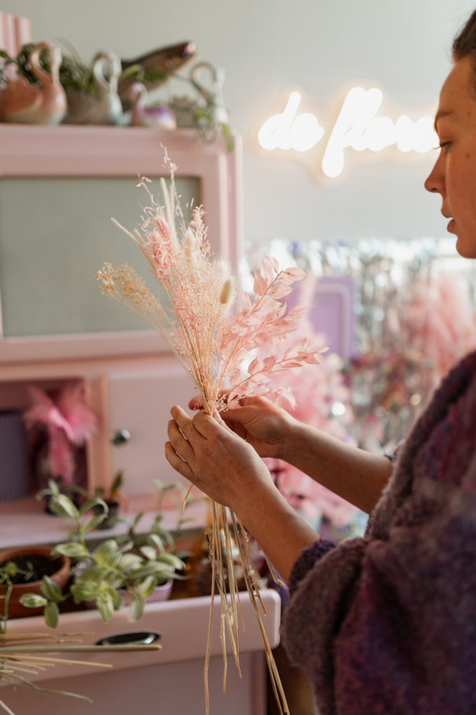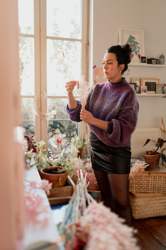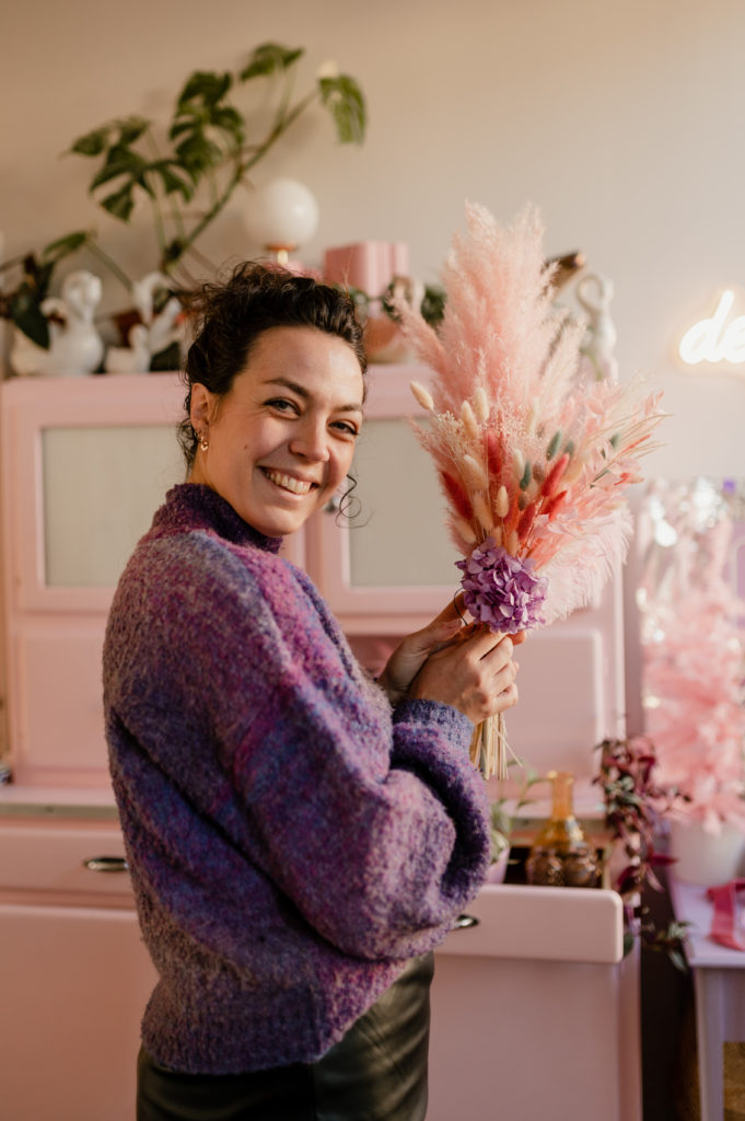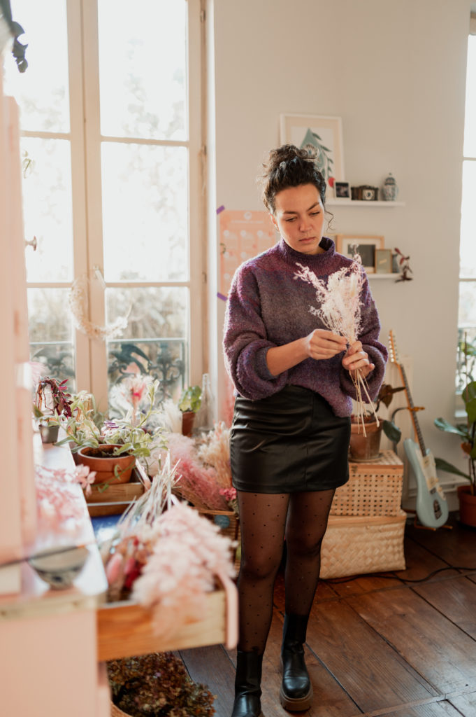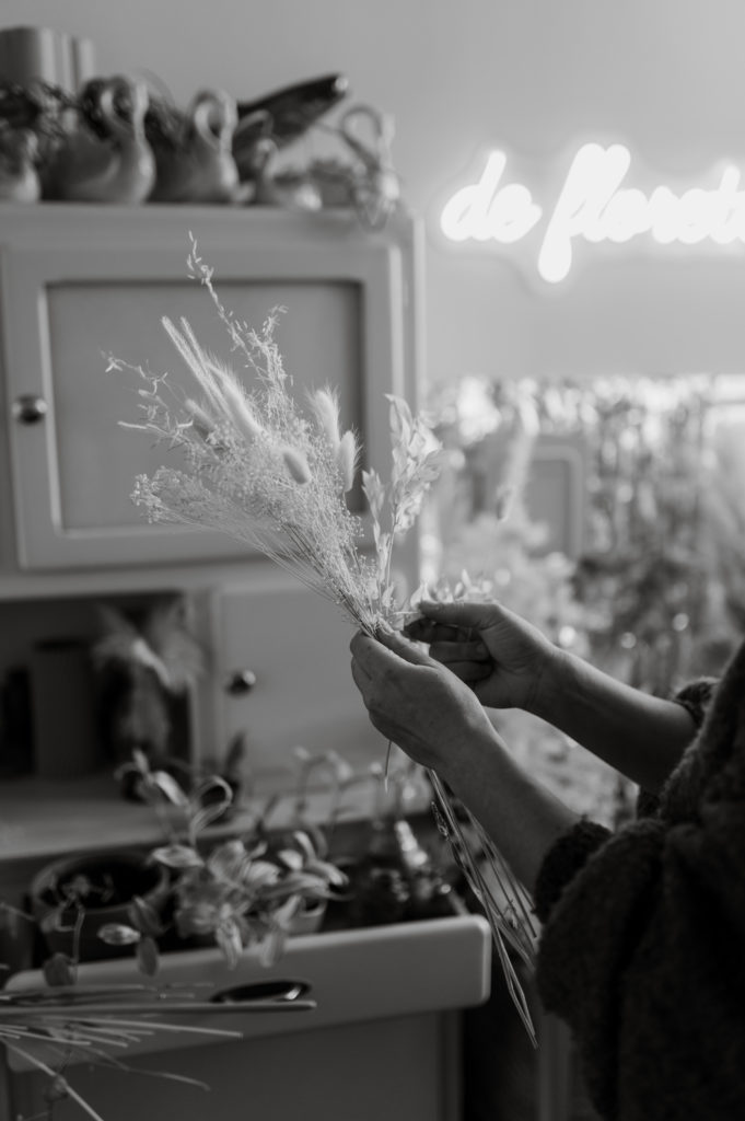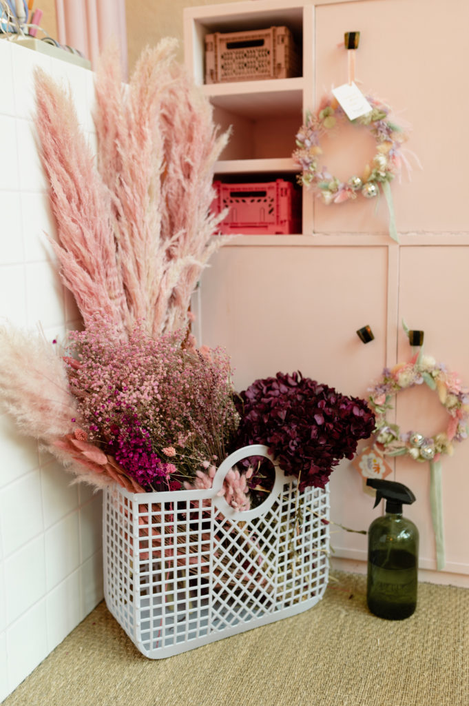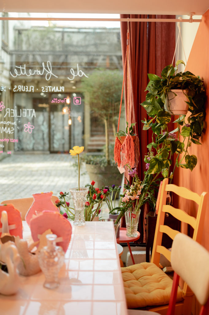 Une boutique colorée, où se mêlent fleurs fraiches soigneusement sélectionnées (de saison et locales, tout ce qu’on aime) et fleurs séchées délicatement disposées sur des meubles chinés.