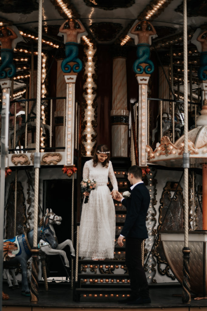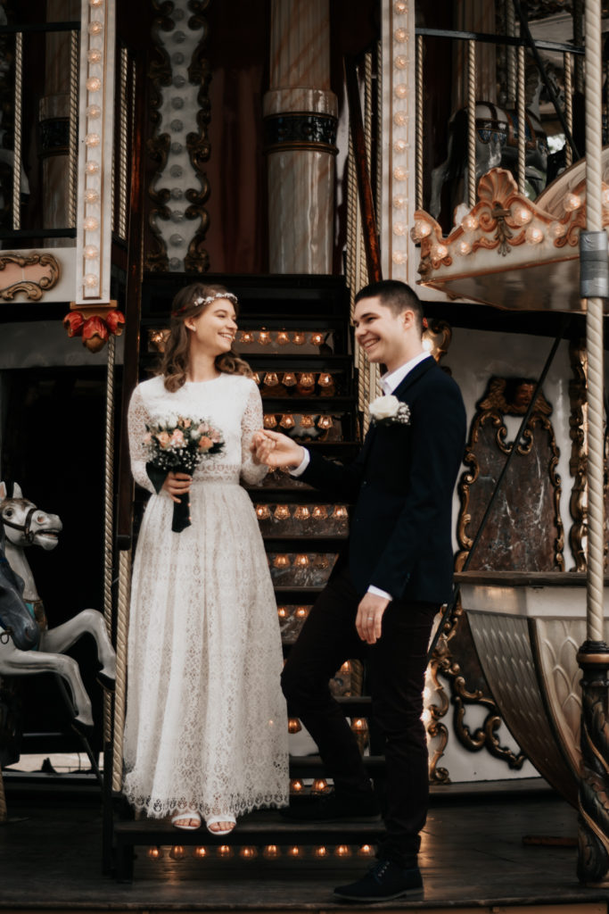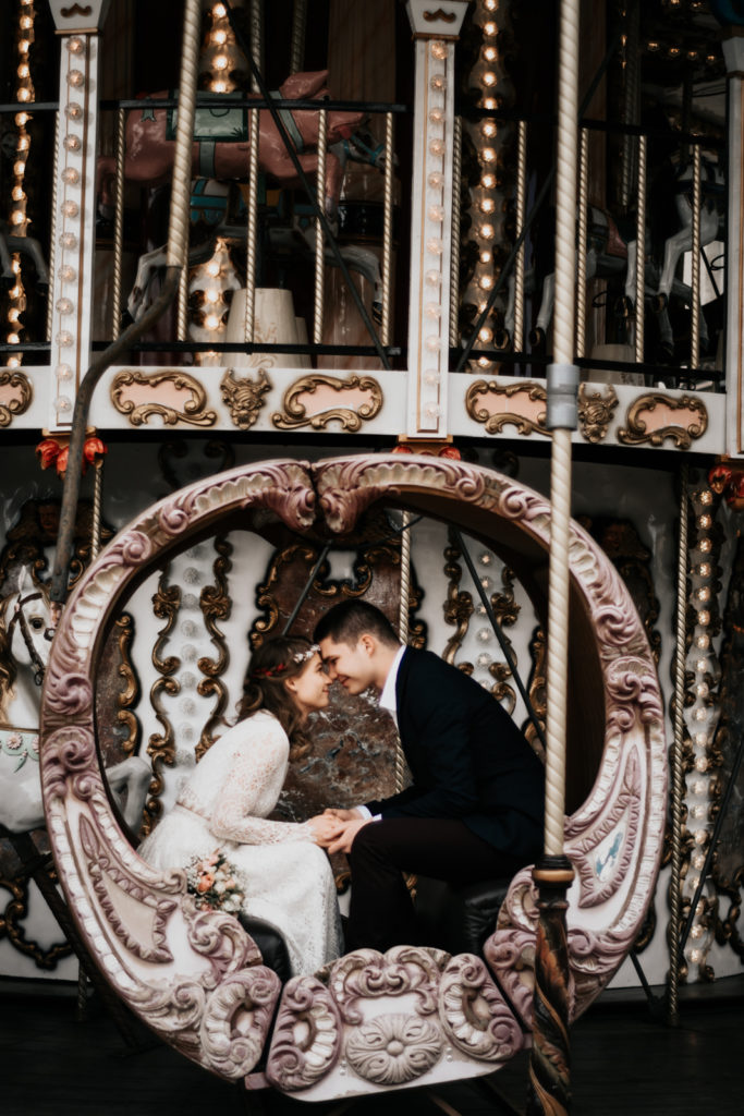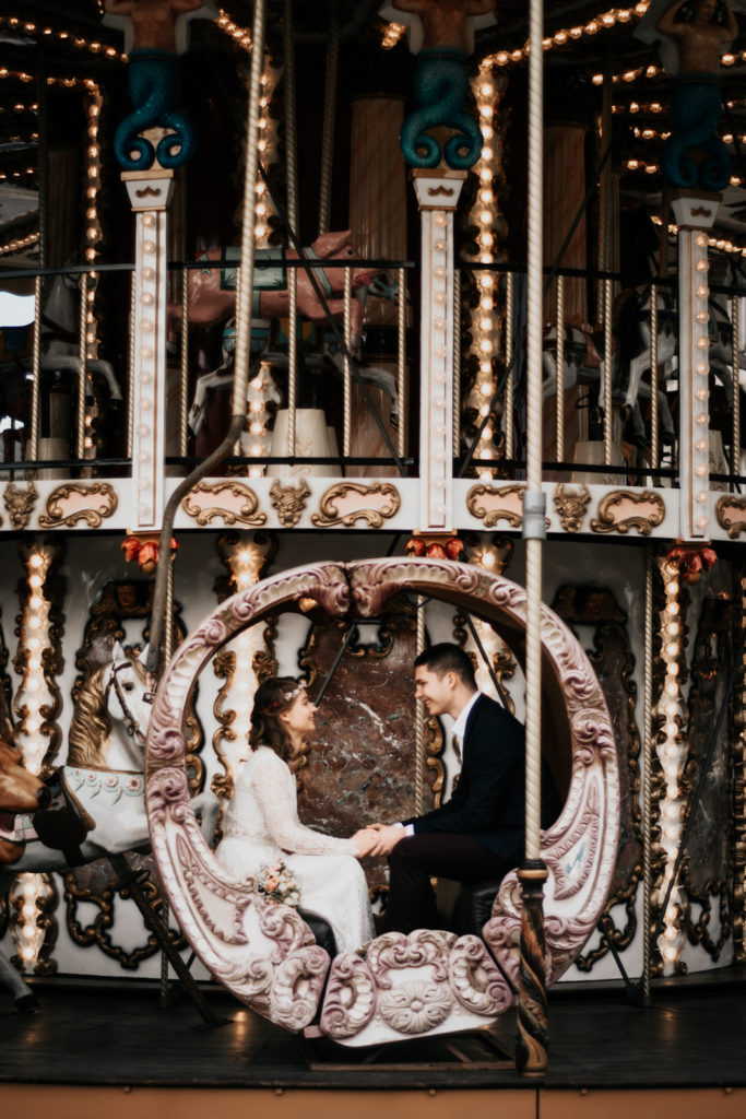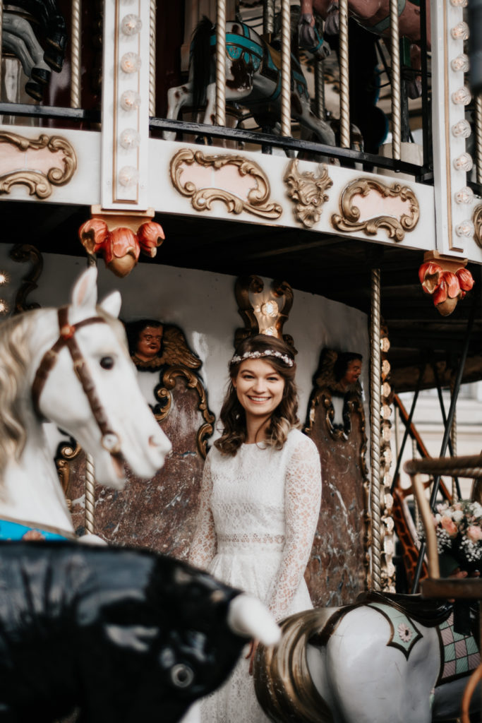 Nous avons donc convenu de nous retrouver dans Périgueux pour faire leur séance couple de mariage. Nous avons commencé par faire les photos dans le joli Jardin des Arènes, puis nous nous sommes dirigés vers les vieilles rues pleines de charme. C’est en rejoignant ces rues que nous sommes passés devant le chouette carrousel ! Il n’aura pas fallu longtemps pour nous décider d’aller y faire des photos. Par chance, le monsieur qui s’occupe du carrousel était très gentil et nous a laissé nous perdre sur son carrousel. C’était chouette!