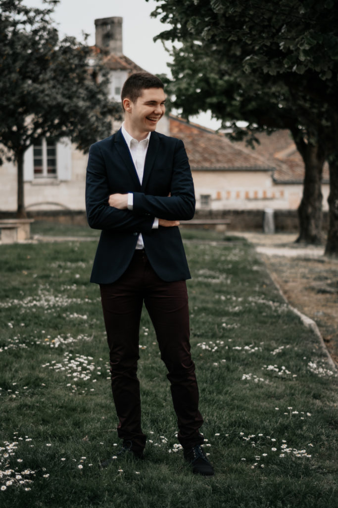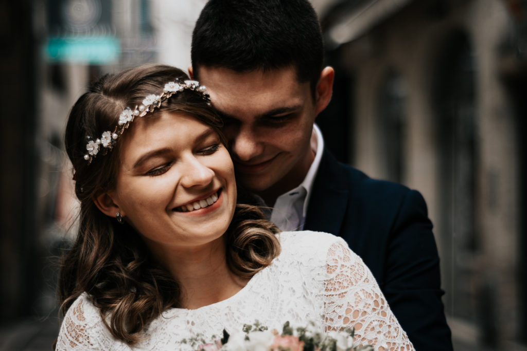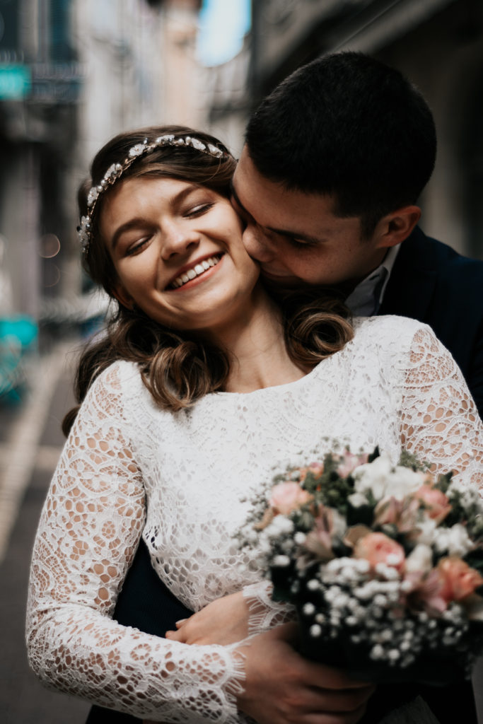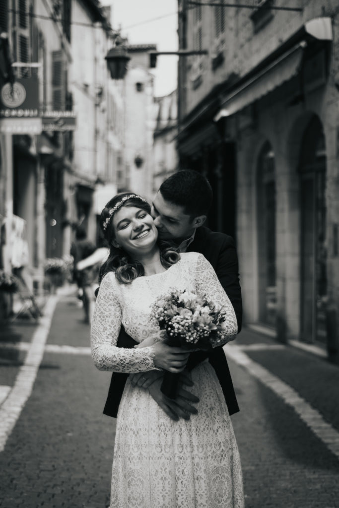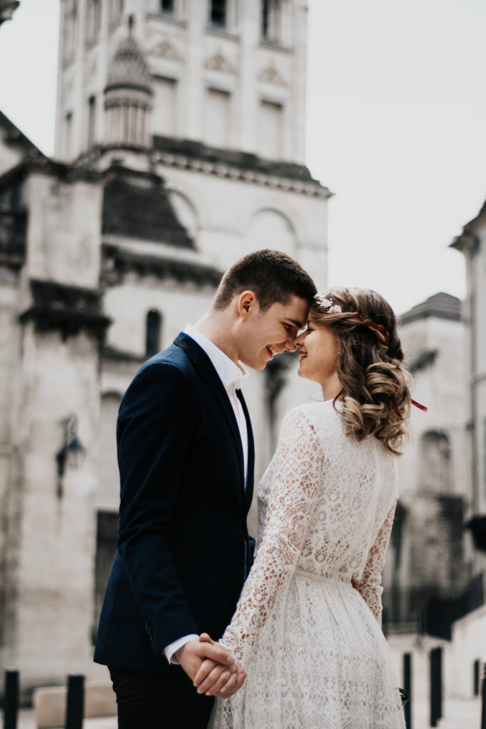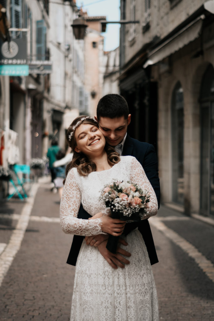 On change de décor en troquant les séances couples dans les bois pour une séance couple de mariage dans les rues de Périgueux.