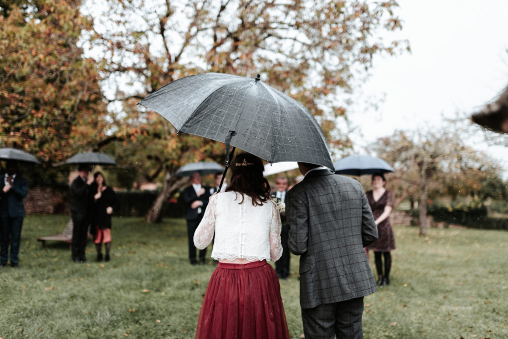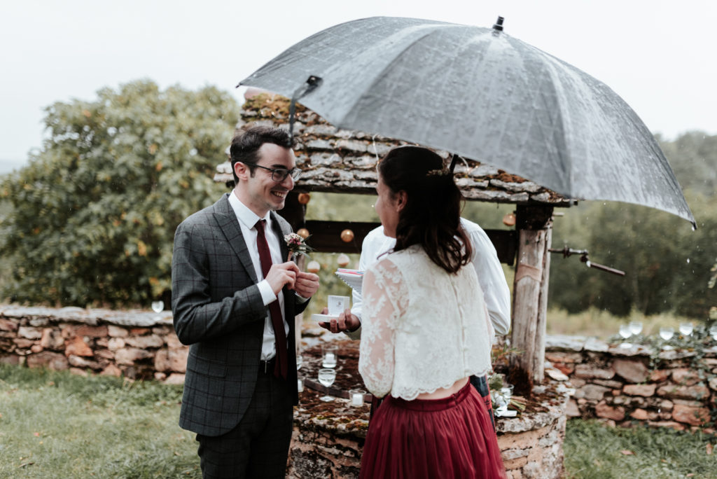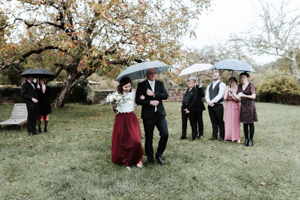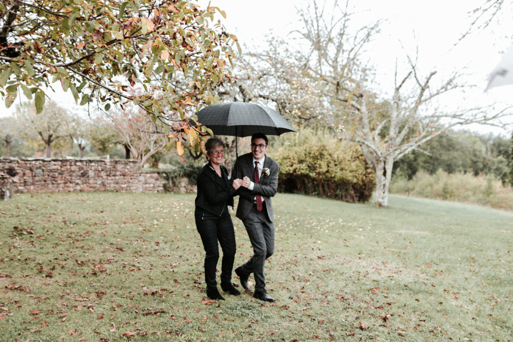 Ils souhaitaient avoir une ambiance automnale pour leur mariage. Et bien, je pense qu’ils en auront eu toutes les facettes! Une journée bercée par des moments ensoleillés parfois chassés par de jolies averses bien automnales. Tout cela avec une touche de feuilles aux jolies teintes d’automne.