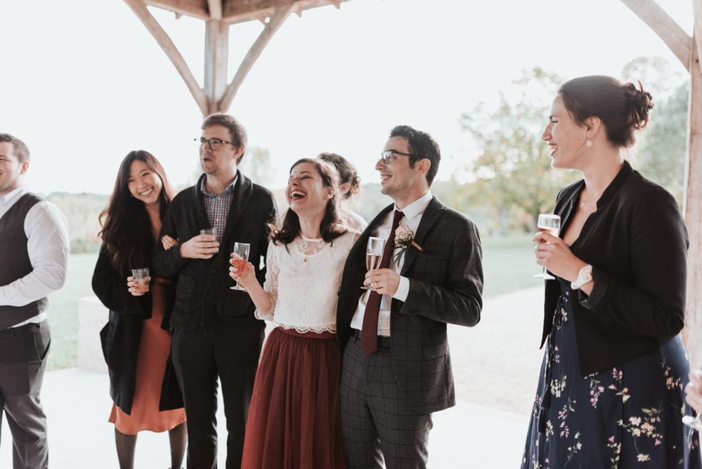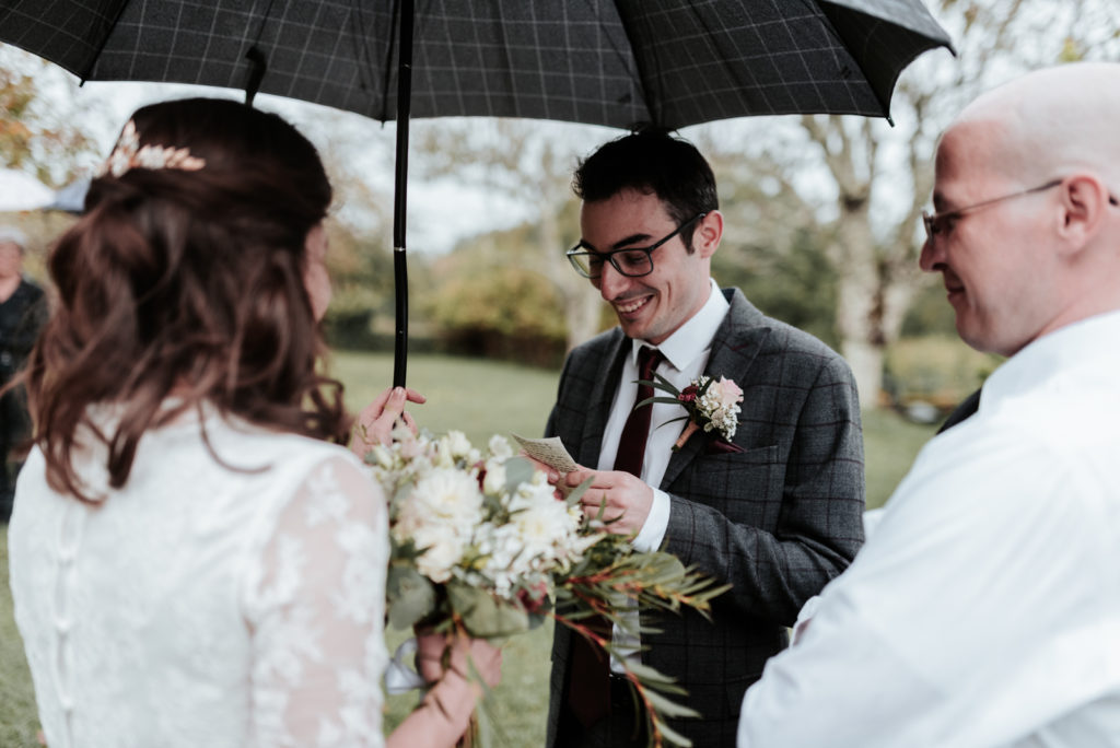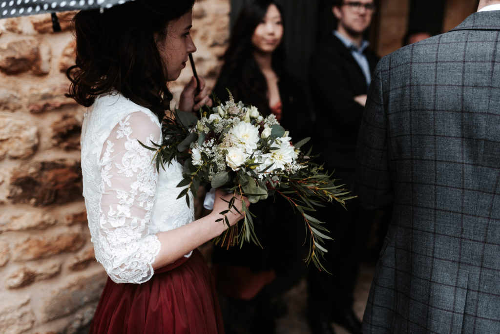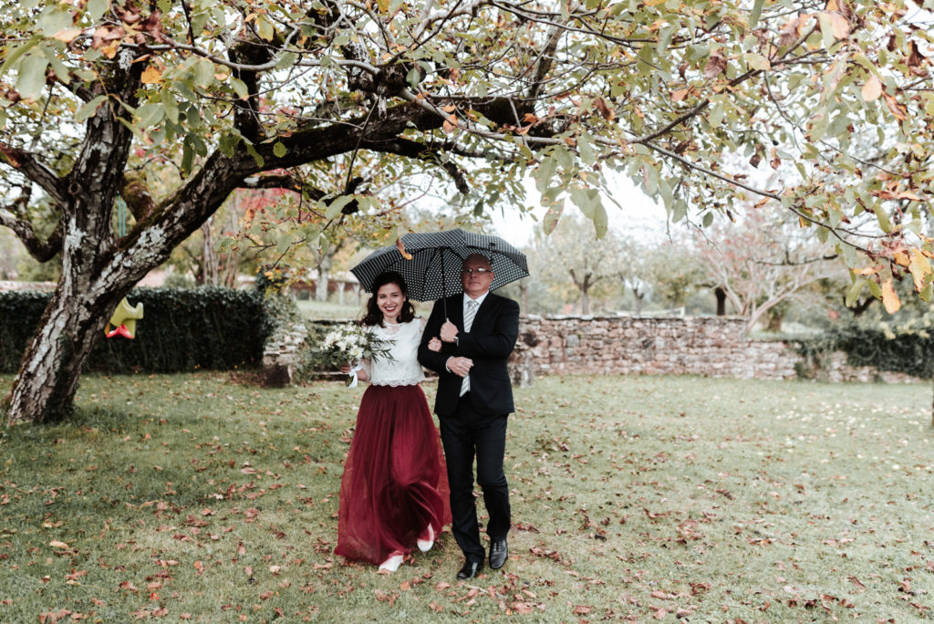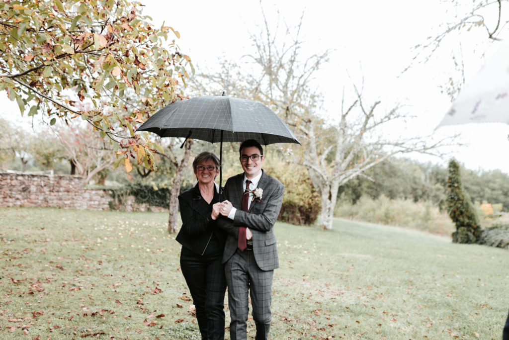 Ils souhaitaient avoir une ambiance automnale pour leur mariage. Et bien, je pense qu’ils en auront eu toutes les facettes! Une journée bercée par des moments ensoleillés parfois chassés par de jolies averses bien automnales. Tout cela avec une touche de feuilles aux jolies teintes d’automne.